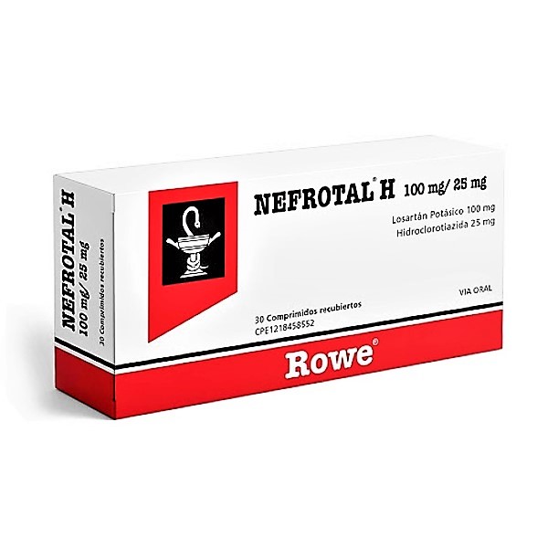 Las tabletas de Nefrotal H contienen Losartán Potásico y Hidroclorotiazida en una proporción de 100mg y 25mg respectivamente, por unidad, en una presentación de 10 tabletas. Se utilizan para el tratamiento de la hipertensión arterial.