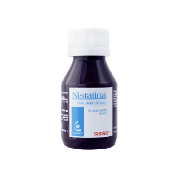 Suspensión oral de nistatina, en envase de 60 ml. Este medicamento antifúngico se utiliza para tratar las infecciones por hongos en la boca, la garganta y el tracto gastrointestinal causadas por levaduras del género Candida. Ayuda a eliminar el crecimiento excesivo de hongos y a aliviar los síntomas asociados.