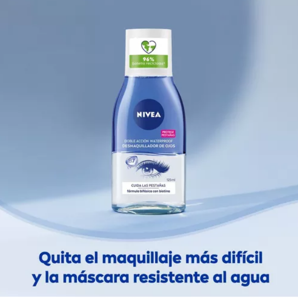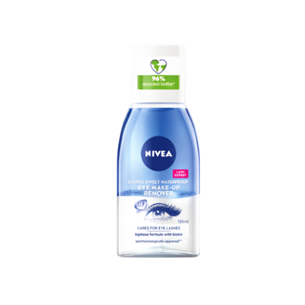 El Desmaquillante de Ojos Bifásico Efecto Dual NIVEA se ha desarrollado teniendo en cuenta el área sensible de los ojos. El producto está enriquecido con agua purificada y flor de aciano y es especialmente suave para la piel sensible alrededor de los ojos. Elimina incluso el maquillaje a prueba de agua de manera suave pero efectiva. El desmaquillante de ojos es adecuado para usuarios de lentes de contacto. Está dermatológicamente y oftalmológicamente probado.