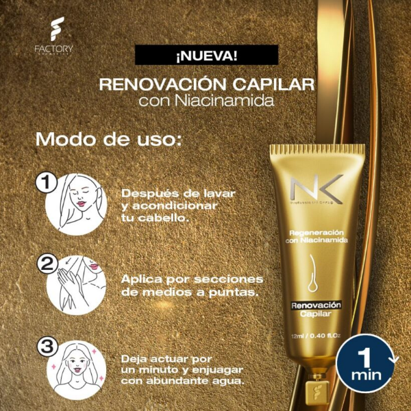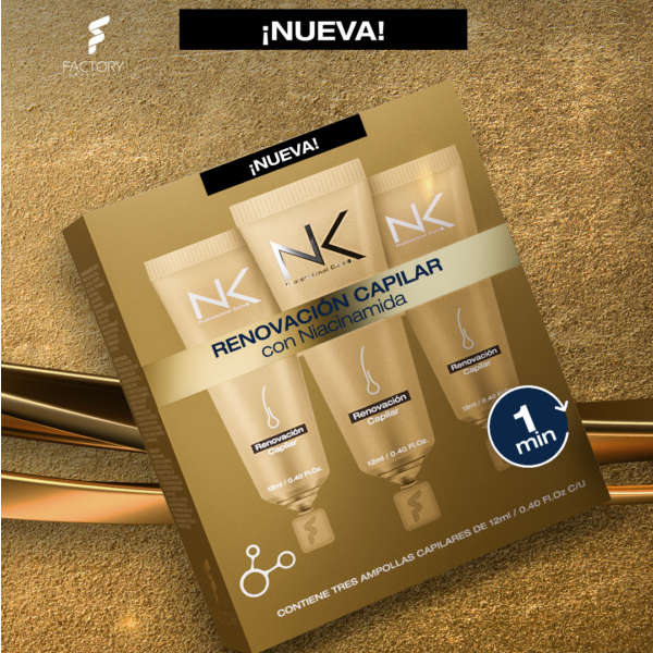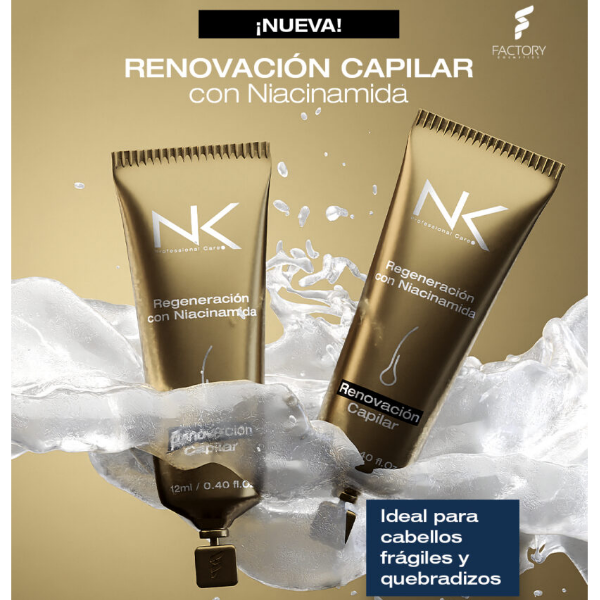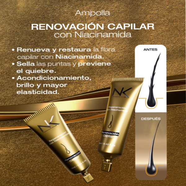 Renueva, restaura, sella, acondiciona, da brillo y mayor elasticidad, son varios de los beneficios de nuestra NUEVA AMPOLLA NK Renovación Capilar con Niacinamida.