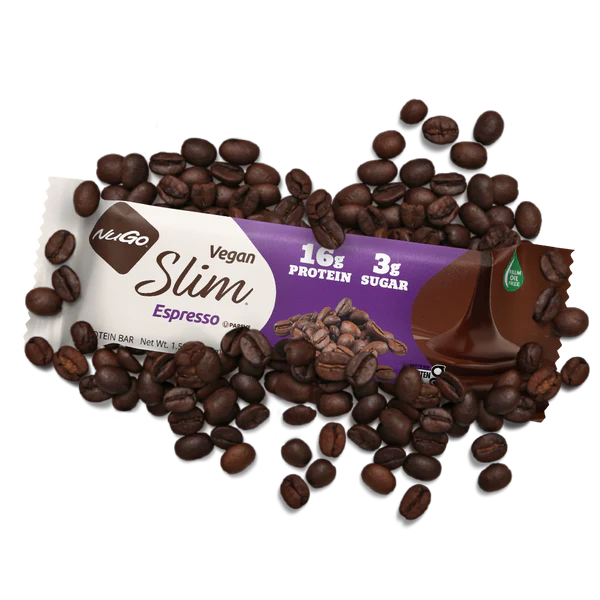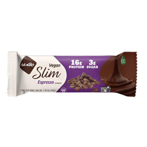 El sueño de todo amante del café. Mejore su próxima pausa para el café con NuGo Slim Espresso, elaborado con granos de café reales y delicioso chocolate negro. Esta barra vegana y sin gluten contiene solo 3 g de azúcar y 16 g de proteína. No es demasiado dulce y está perfectamente equilibrada. Olvídese del café con leche moca y opte por NuGo Slim Espresso.