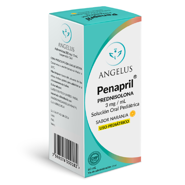 Penapril jarabe pediátrico con Prednisolona 3 mg/ml en presentación de 60 ml de Angelus. Indicado para el tratamiento de alergias, asma y condiciones inflamatorias en niños.