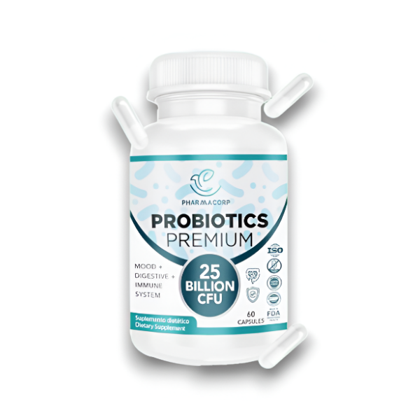 Suplemento Probiotics Premium de Pharmacorp, con 25 billones de cultivos vivos por cápsula, presentación de 60 cápsulas. Formulado para apoyar la salud digestiva y el sistema inmunológico con una combinación de probióticos de alta calidad.