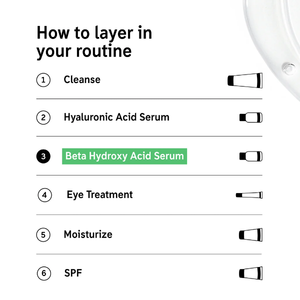 - Después de limpiar e hidratar con Suero de ácido hialurónico : aplique suavemente 1 o 2 gotas de suero de betahidroxiácido en el rostro y el cuello.