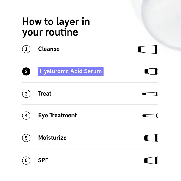 - Sugerimos utilizar el suero de ácido hialurónico como primer paso después de la limpieza para ayudar a atraer la humedad hacia la piel.