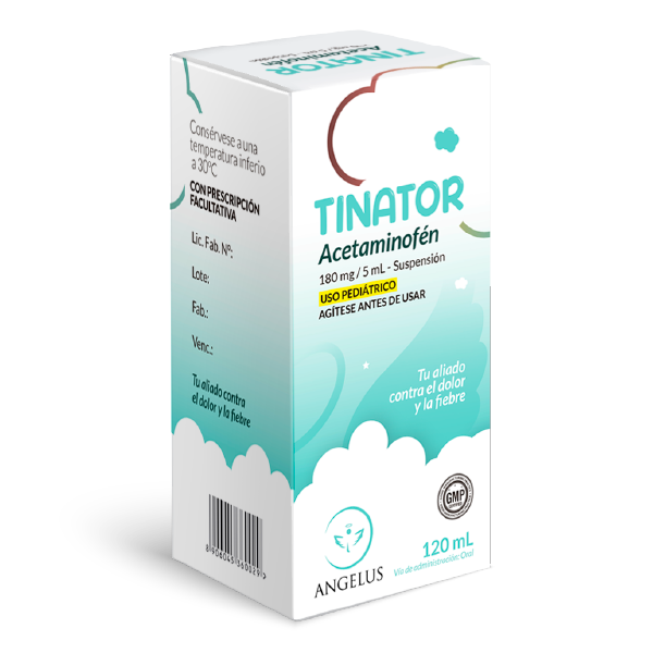 Jarabe pediátrico Tinator con Acetaminofén 180mg/5ml en presentación de 120 ml de Angelus. Utilizado para reducir la fiebre y aliviar el dolor leve a moderado en niños, con un agradable sabor.