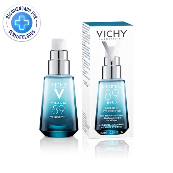 - Minéral 89 Gel Ojos con Ácido Hialurónico hidrata, ilumina y suaviza las líneas de expresión alrededor del delicado contorno de los ojos. Esta fórmula, con una reconfortante crema en textura gel, combina un 89% de agua volcánica de Vichy, ácido hialurónico puro y cafeína para una mirada más luminosa y descansada.