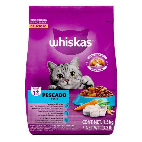 La nueva receta de alimento seco Whiskas® combina la nutrición que tu gato necesita con el sabor que ama. Desarrollada nutricionalmente con veterinarios para ayudarlo a mantenerse saludable y feliz de por vida. Y ahora con prebióticos que ayudan/contribuyen a una buena digestión.